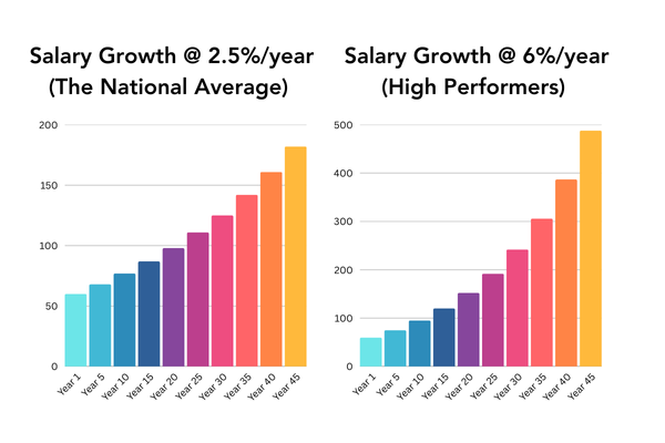 High-performing workers wages grow at a rate of 6% a year, as opposed to 2.5% for the national average worker. This translates into over $9M more income in a career, starting at entry-level wages.